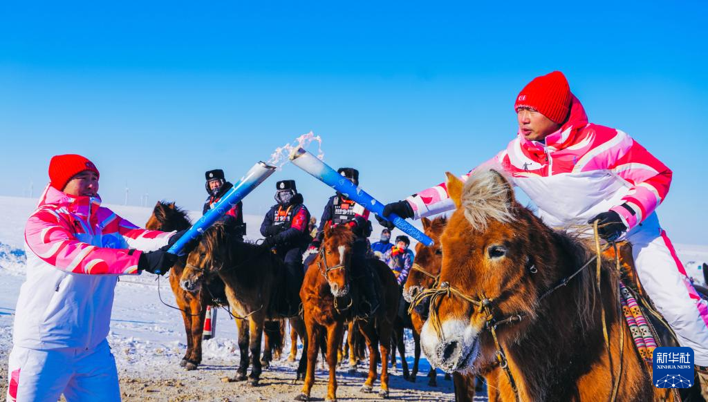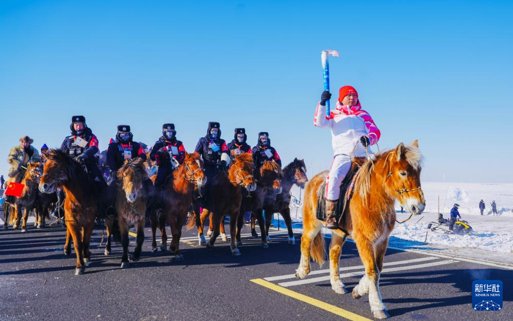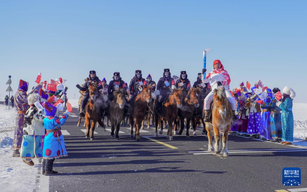 2月3日,火炬手米吉格道尔吉在火炬传递活动中骑马传递火炬。新华社发(西日呼摄)