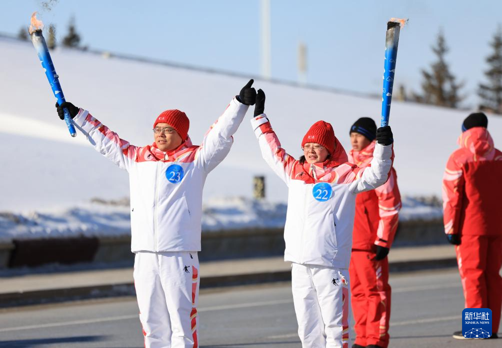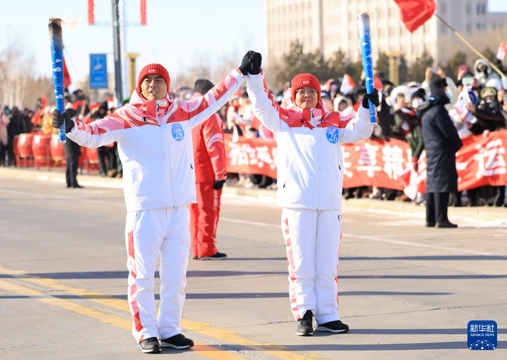 2月3日,火炬手景晓涛(右)、乌兰托娅在火炬传递活动中。新华社发(康文魁摄)