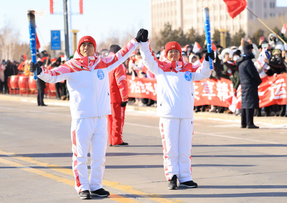 2月3日,火炬手朱兵(左)、孟繁英在火炬传递活动中。新华社发(康文魁摄)
