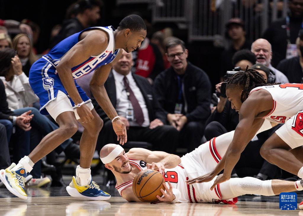 2月3日,公牛队球员卡鲁索(下)在比赛中拼抢。新华社发(乔尔·莱纳摄)