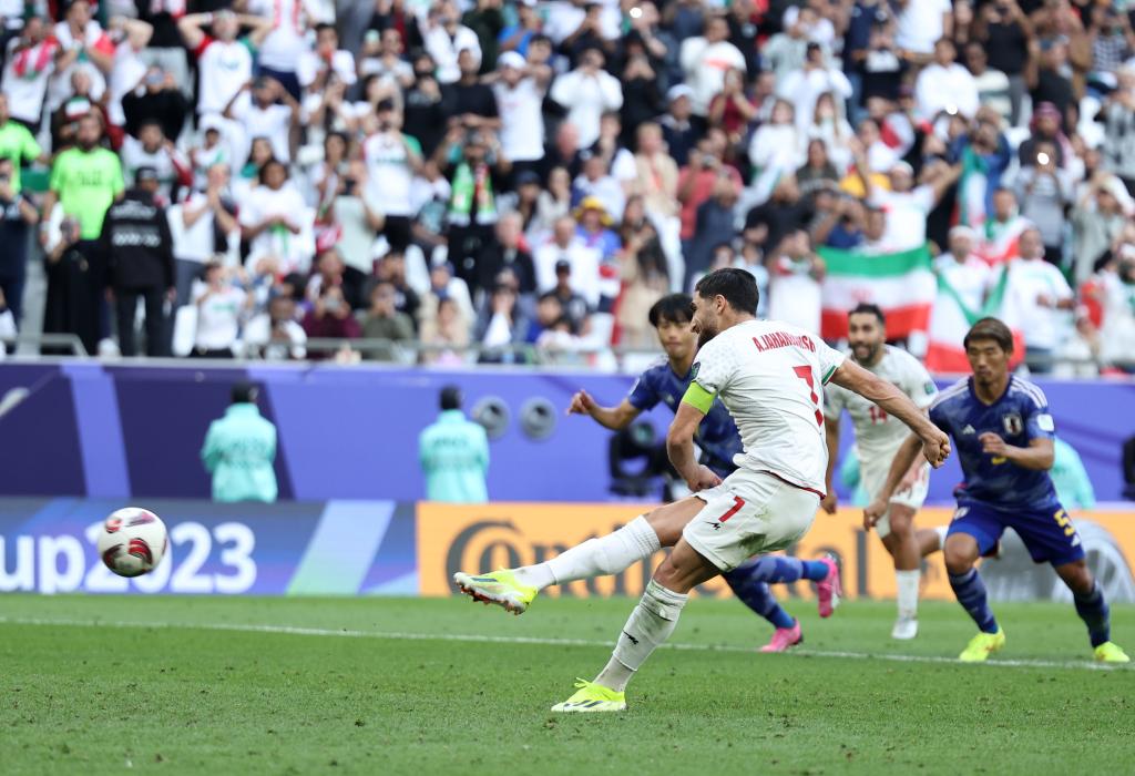 2月3日,伊朗队球员贾汗巴赫什(前)在下半场加时阶段点球射门得分。新华社记者 贾浩成 摄