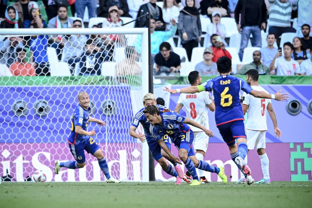 2月3日,日本队球员守田英正(左三)在比赛中进球后庆祝。新华社记者 江汉 摄