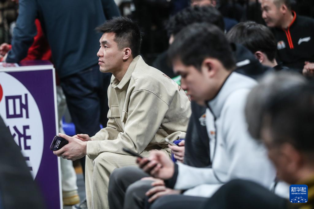 2月5日,辽宁本钢队球员郭艾伦(左)在场边观赛。新华社记者 潘昱龙 摄