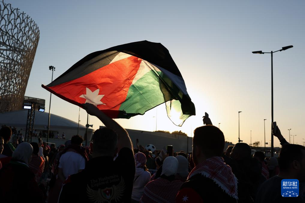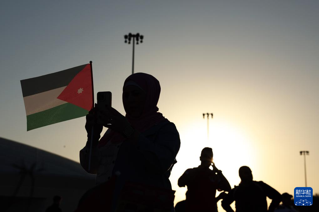 2月6日,约旦队球迷在球场外挥舞约旦国旗。新华社记者 贾浩成 摄