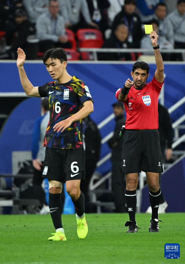 2月6日,主裁判向韩国队球员黄仁范(左)出示黄牌。新华社记者 孙凡越 摄
