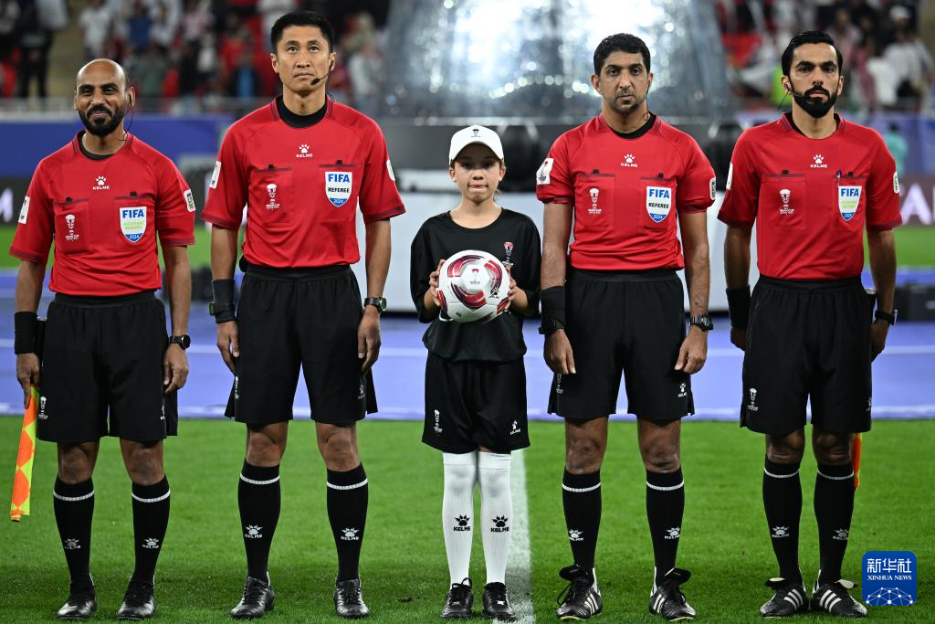 2月6日,主裁判哈桑在比赛中查看VAR(视频助理裁判)。新华社记者 贾浩成 摄