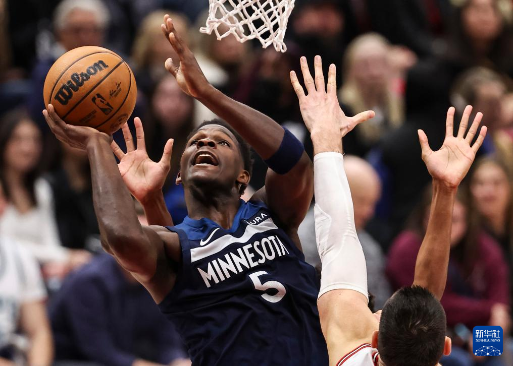 2月6日,森林狼队球员安东尼·爱德华兹在比赛中上篮。新华社发(乔尔·莱纳摄)