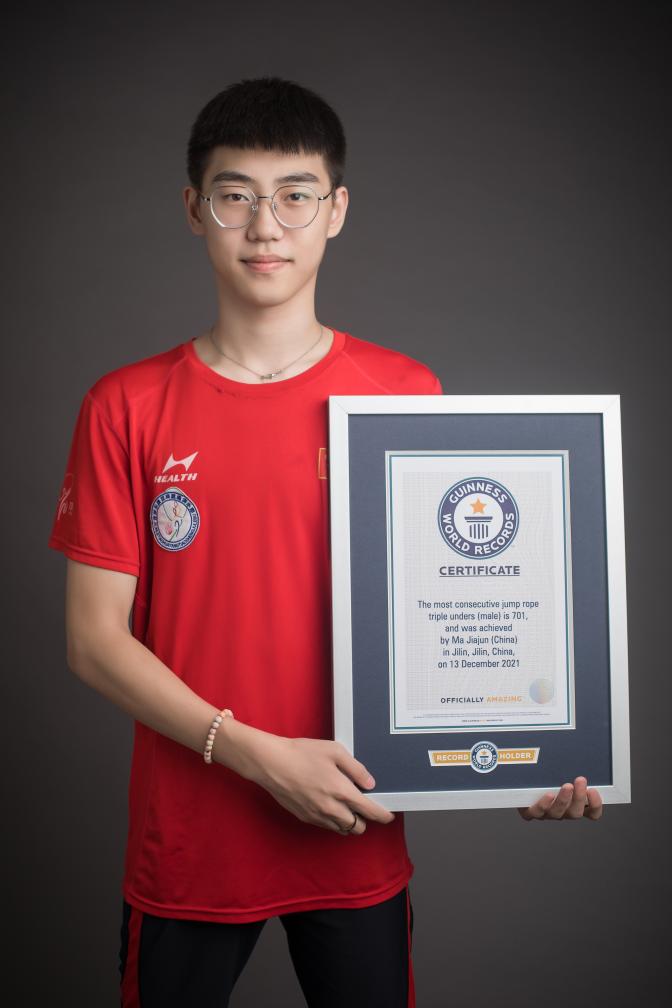 马家俊获得“连续跳最多的三摇跳绳(男性)”吉尼斯世界纪录认证书