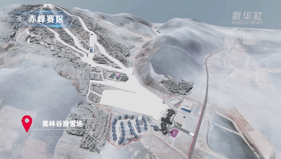 赤峰赛区的赛场美林谷滑雪场位于赤峰市喀喇沁旗美林镇内,喀喇沁旗冬季的最低气温在零下25摄氏度左右,有利于积雪保存。较大的海拔高度区间差,也有利于滑雪竞速项目的开展。通过虚拟仿真、数字沙盘等技术生成的模型,我们看到松树和白桦树等植被布满山坡,洁白的雪道穿插其中,宛如一个亲近自然、回归自然的“世外桃源”。