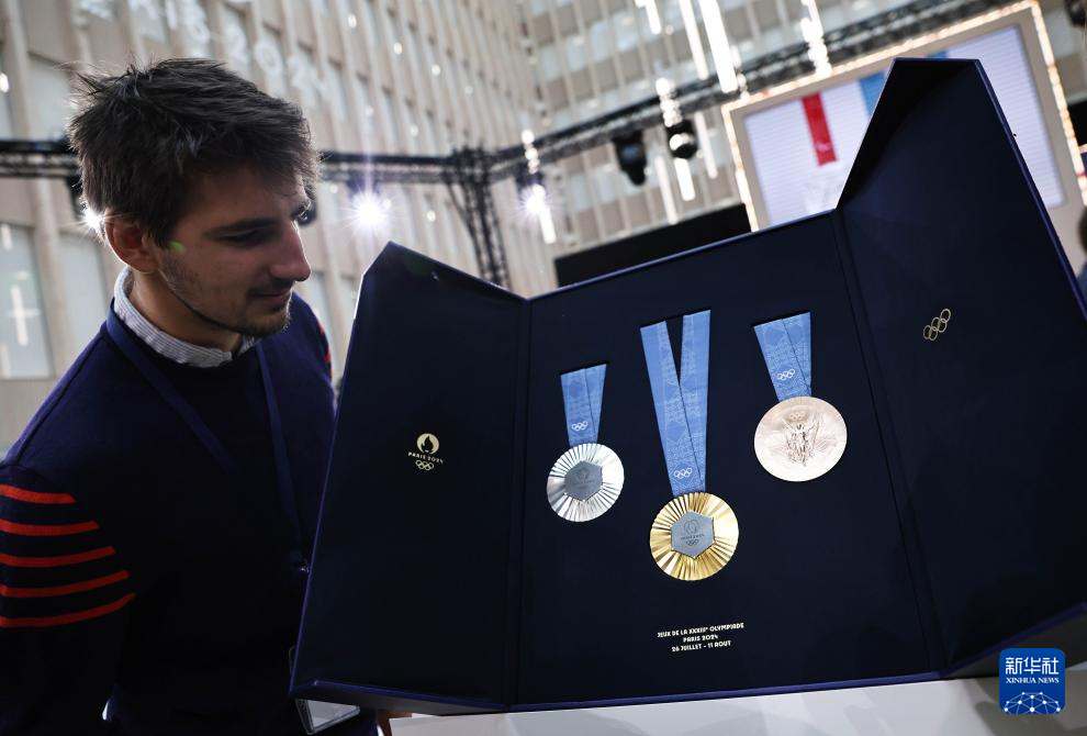 这是2月8日在发布现场拍摄的巴黎奥运会奖牌。新华社记者 高静 摄