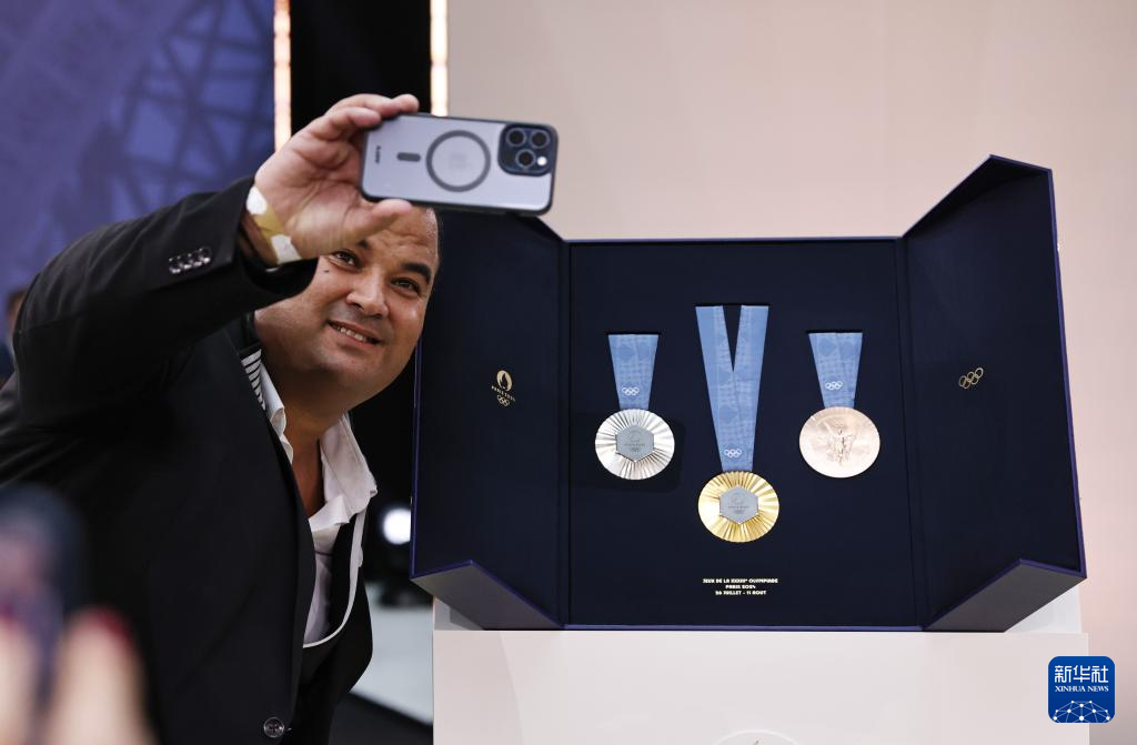 2月8日,一名与会人员在巴黎奥运会奖牌旁自拍留念。新华社记者 高静 摄
