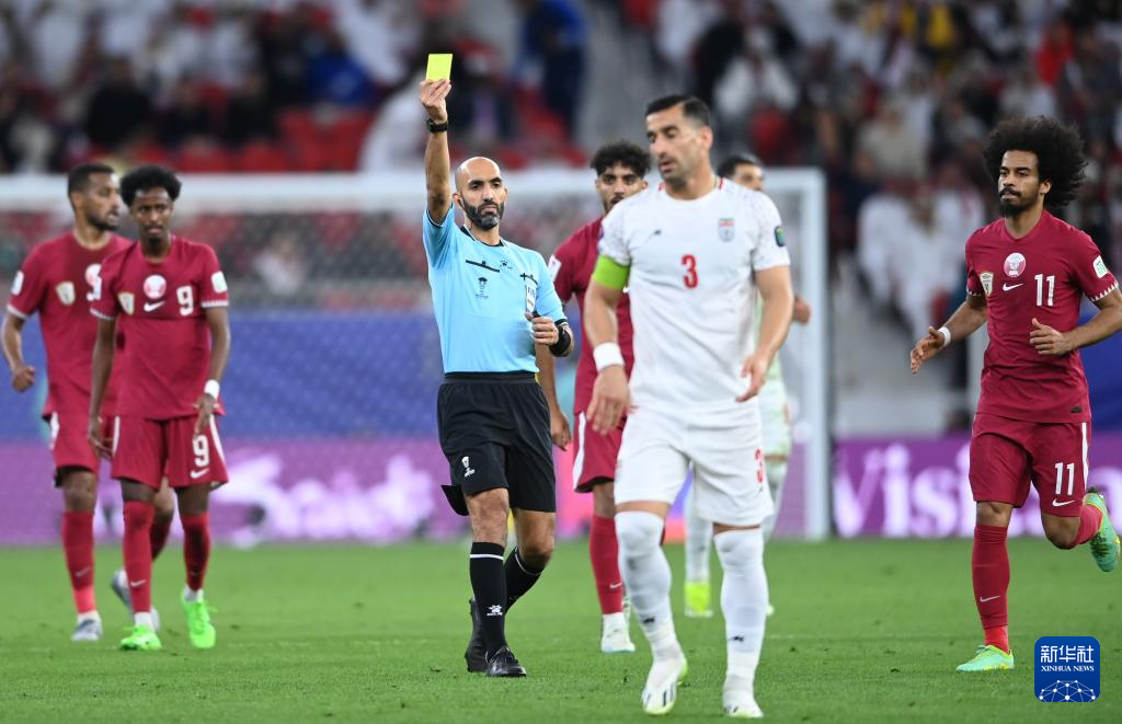 2月7日,主裁判在比赛中向伊朗队球员哈伊萨菲(右二)出示黄牌。新华社记者 江汉 摄