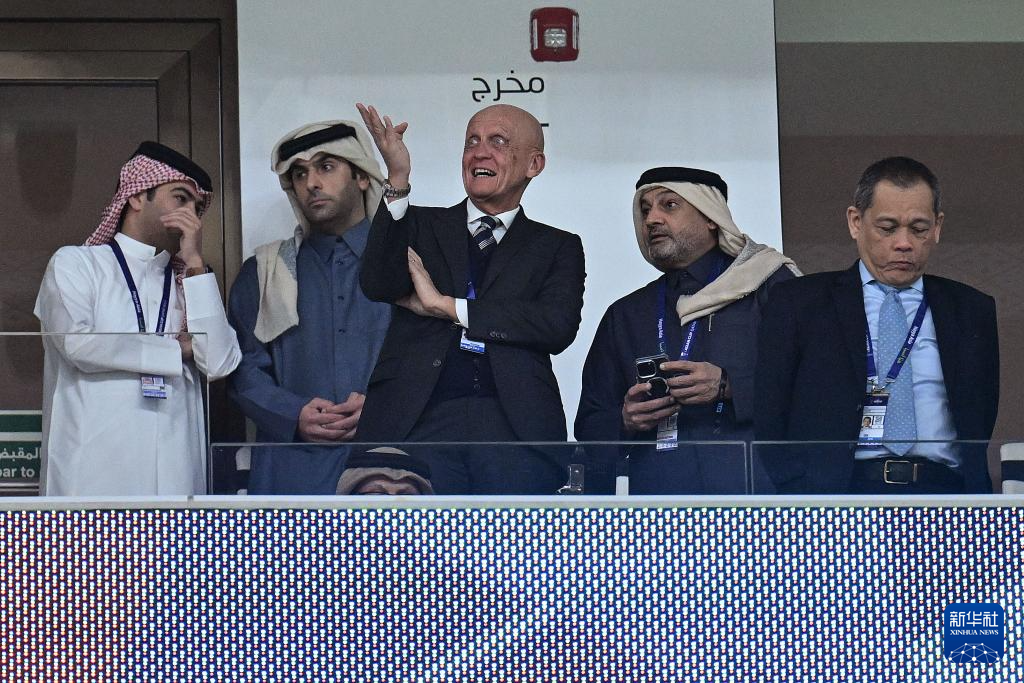 2月7日,国际足联裁判委员会主席、意大利前足球裁判员科里纳(中)在看台观战。新华社记者 孙凡越 摄