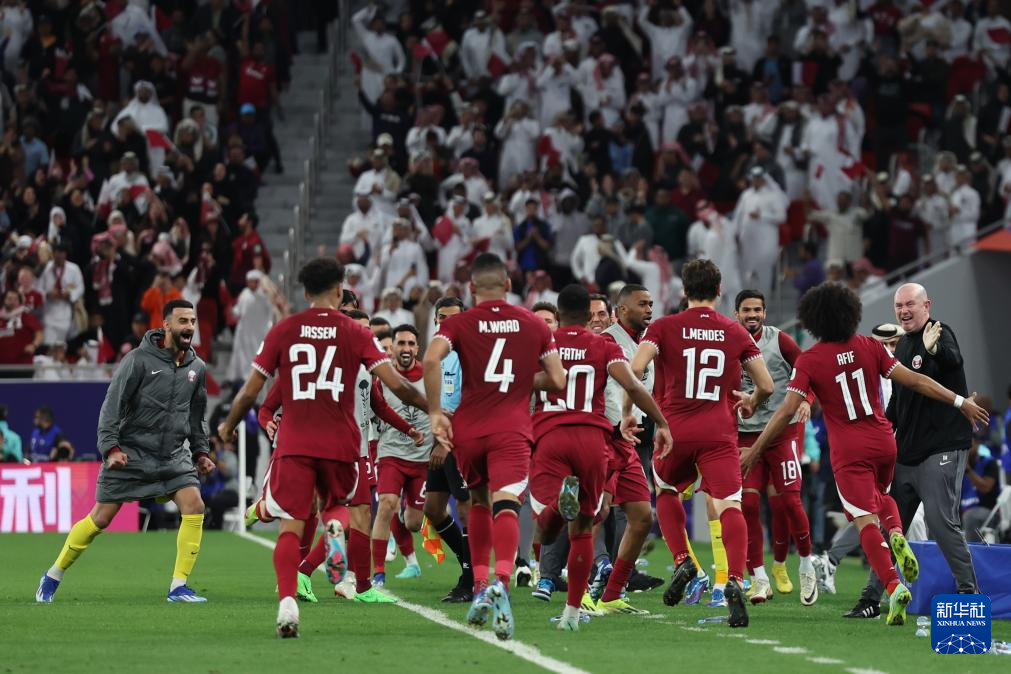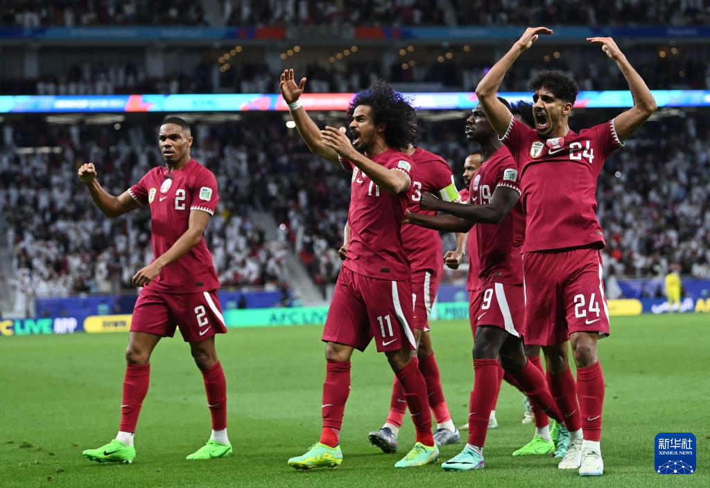 2月7日,卡塔尔队球员阿克拉姆·阿菲夫(右二)在比赛中射门得分后与队友庆祝。新华社记者 贾浩成 摄