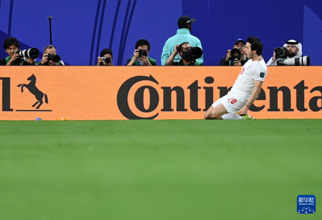 2月7日,伊朗队球员萨尔达·阿兹蒙庆祝进球。新华社记者 江汉 摄