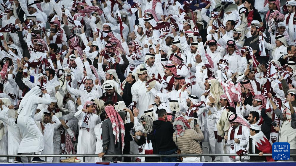 2月7日,卡塔尔队球迷在看台庆祝卡塔尔队进球。新华社记者 孙凡越 摄
