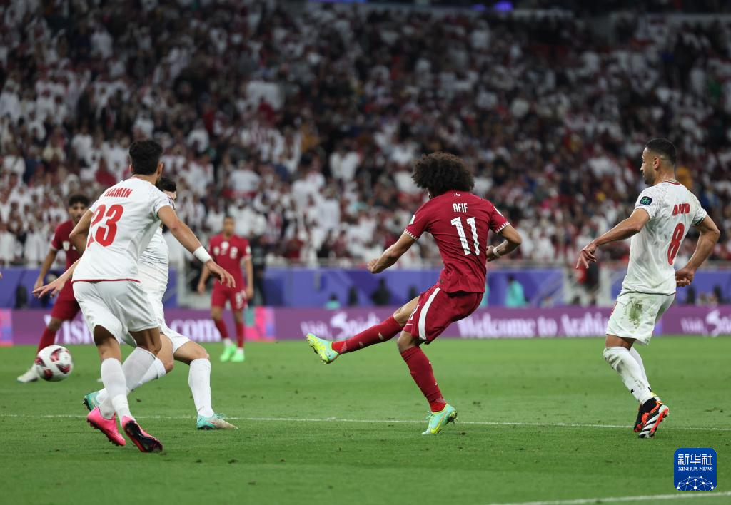 2月7日,卡塔尔队球员阿克拉姆·阿菲夫(右二)在比赛中射门得分。新华社记者 贾浩成 摄