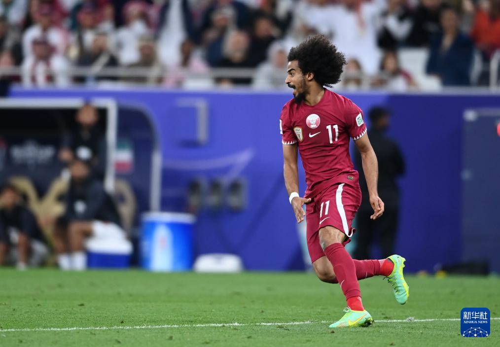 2月7日,卡塔尔队球员阿克拉姆·阿菲夫庆祝进球。新华社记者 江汉 摄