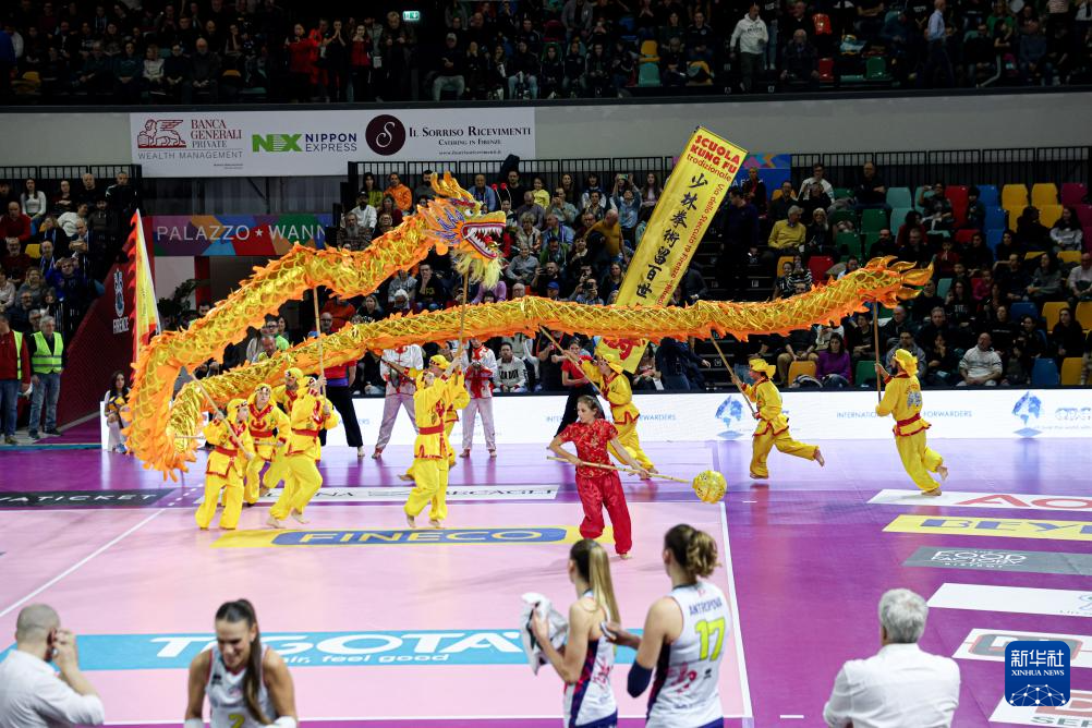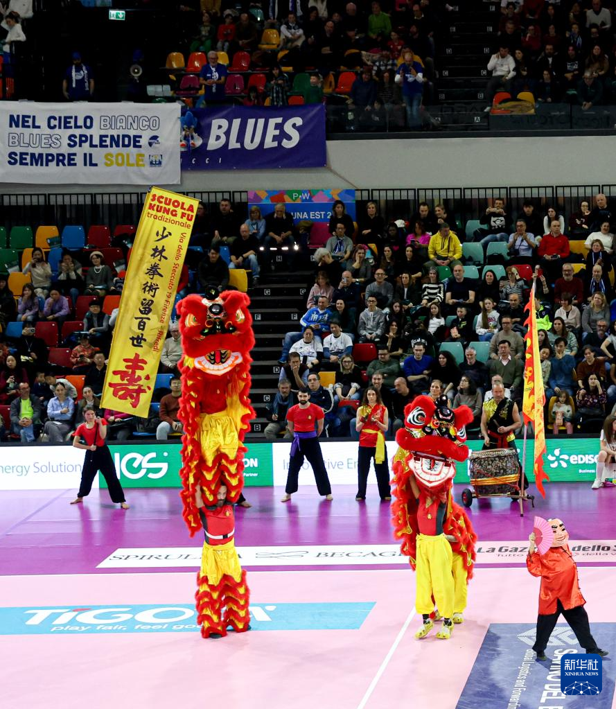 近日,为庆祝中国龙年春节,意大利斯坎迪奇排球俱乐部在比赛局间休息时间为现场观众安排了精彩的舞龙舞狮表演。该舞龙舞狮表演队由意大利当地的中国功夫爱好者组成。