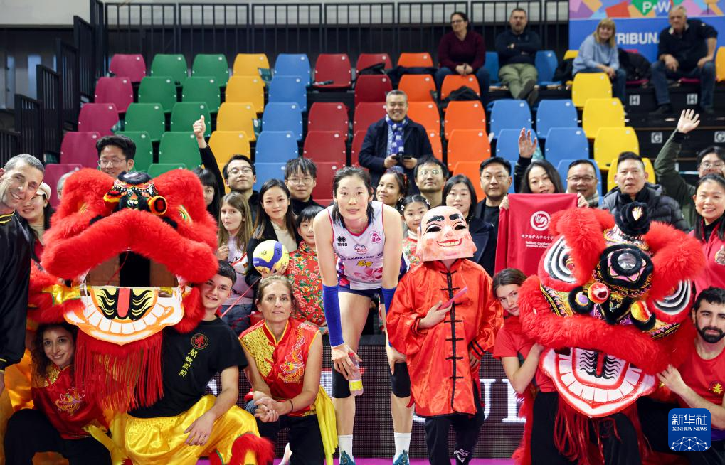 2月4日,在意大利斯坎迪奇,斯坎迪奇队球员朱婷与当地舞龙舞狮表演者和观众在赛后合影。新华社记者 李京 摄