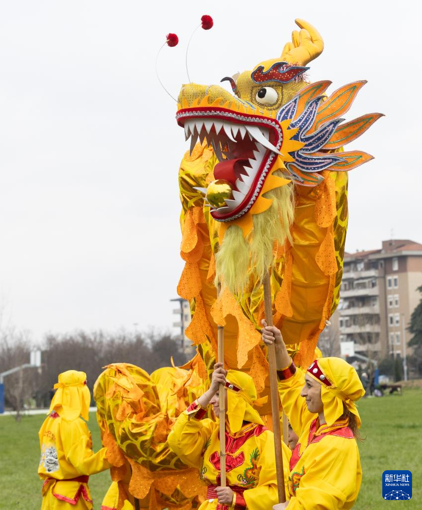 这是2月4日在意大利斯坎迪奇排球俱乐部主场体育馆外拍摄的舞龙表演。新华社记者 李京 摄