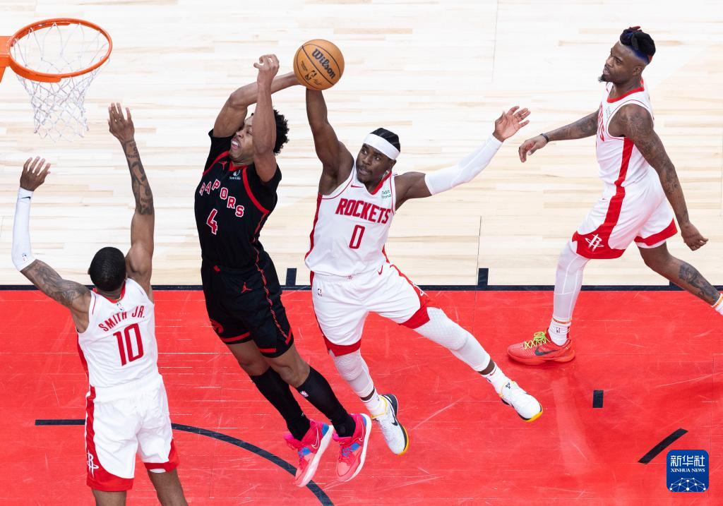 2月9日,火箭队球员阿隆·霍勒迪(右二)在比赛中封盖猛龙队球员斯科蒂·巴恩斯(左二)。新华社发(邹峥摄)