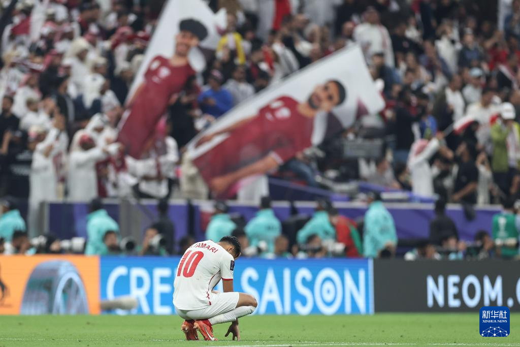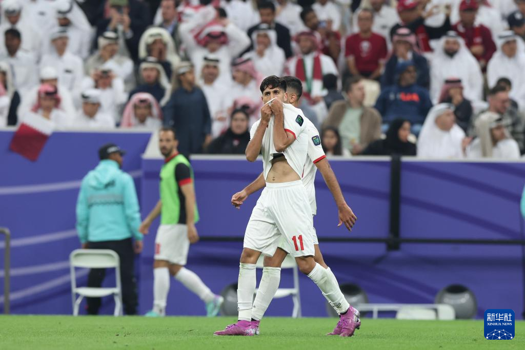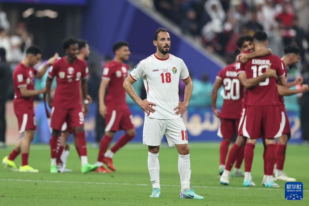 2月10日,约旦队球员穆萨·塔马里在卡塔尔队球员阿克拉姆·阿菲夫打入第三粒进球后。新华社记者 贾浩成 摄