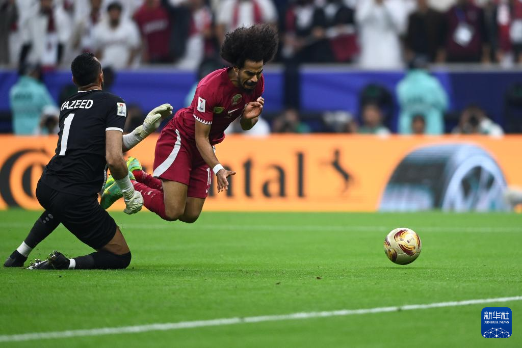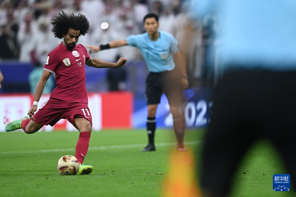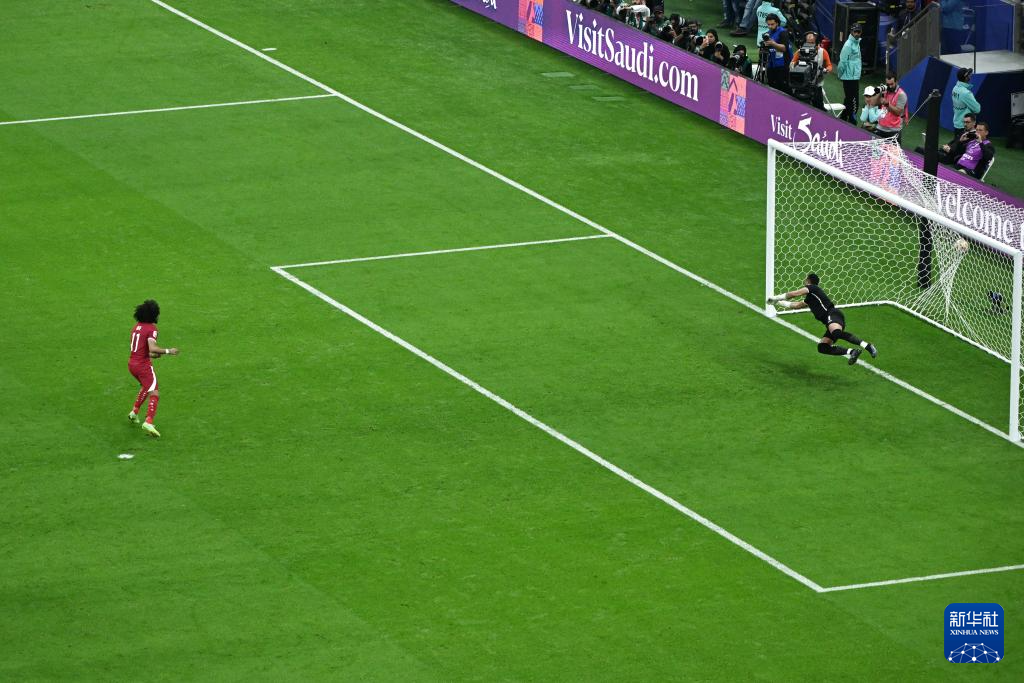 2月10日,卡塔尔队球员阿克拉姆·阿菲夫在比赛中第三次主罚点球破门。新华社记者 江汉 摄