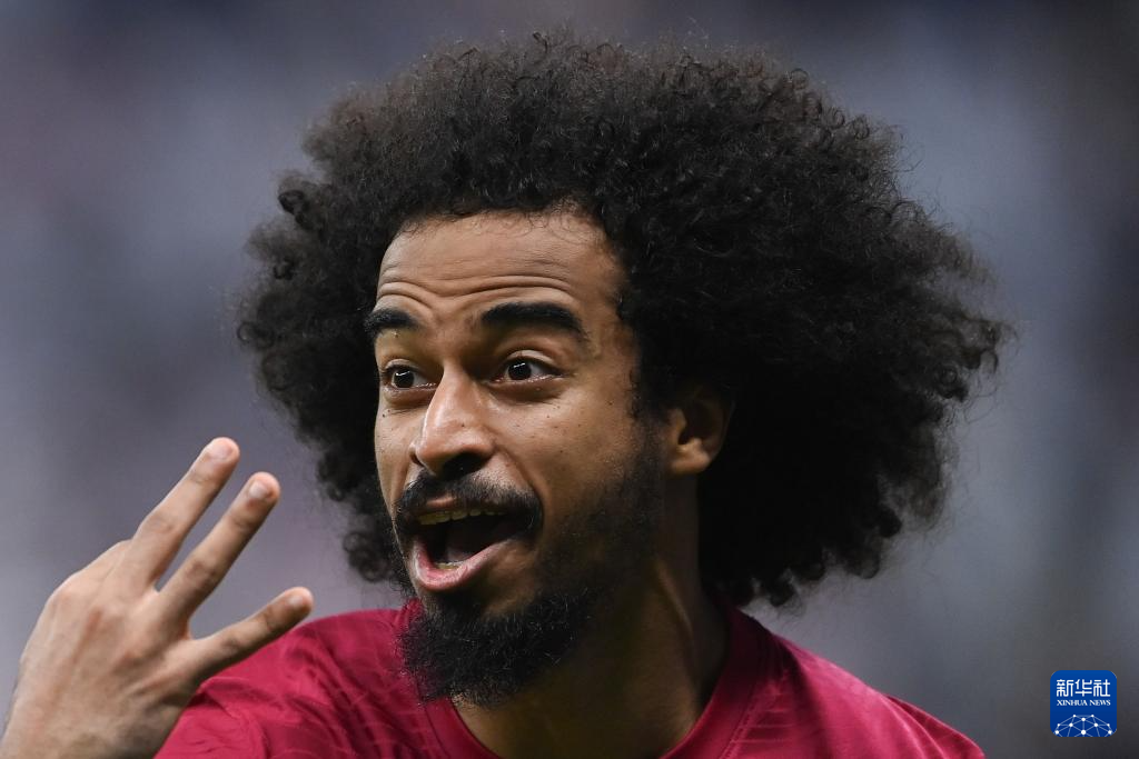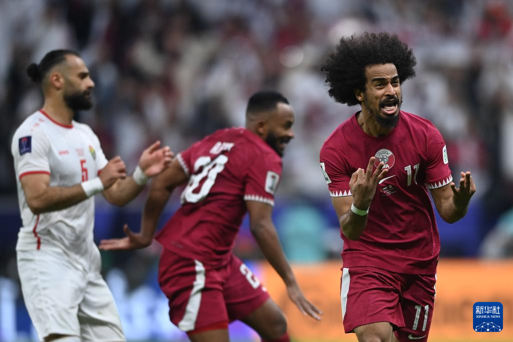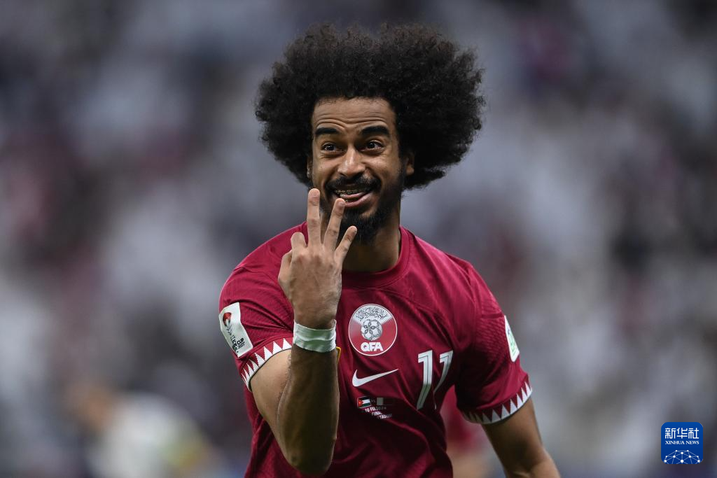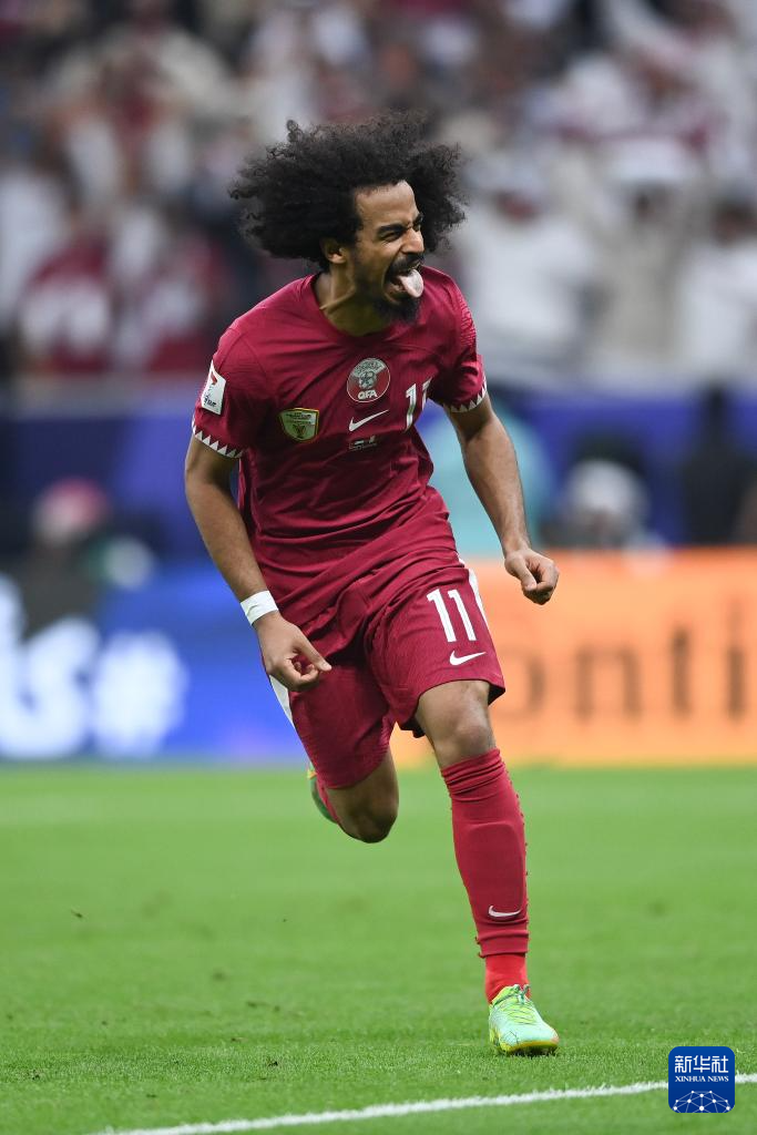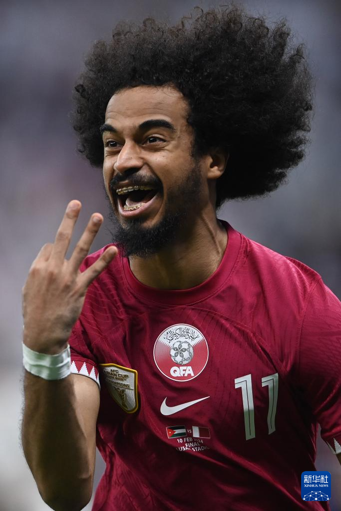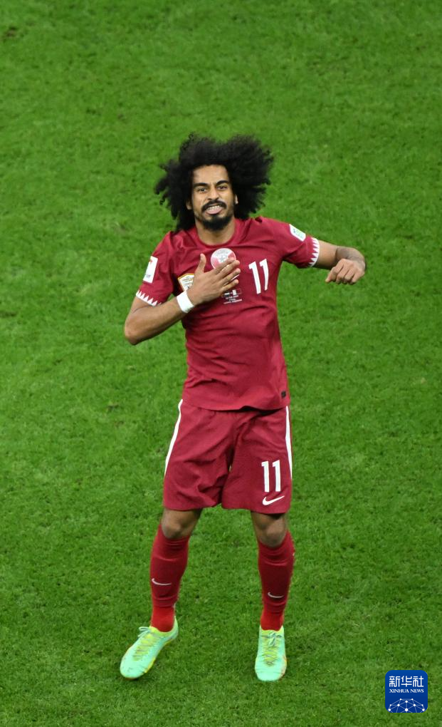 2月10日,卡塔尔队球员阿克拉姆·阿菲夫庆祝第三粒进球。新华社记者 江汉 摄