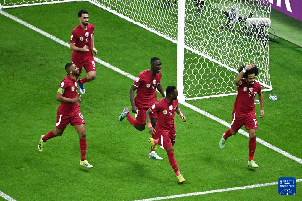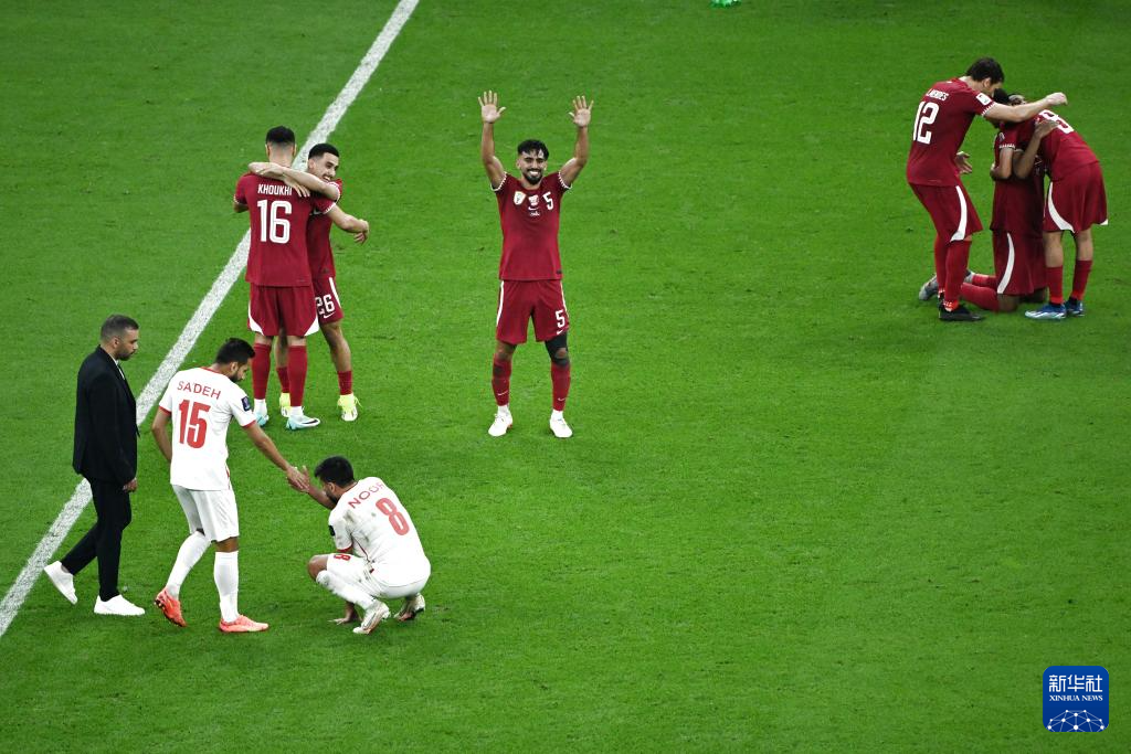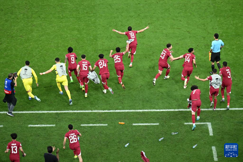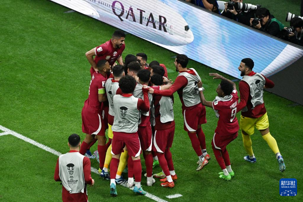 2月10日,卡塔尔队球员庆祝进球。新华社记者 孙凡越 摄