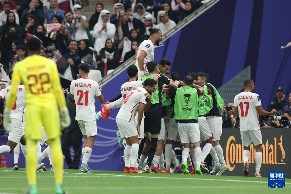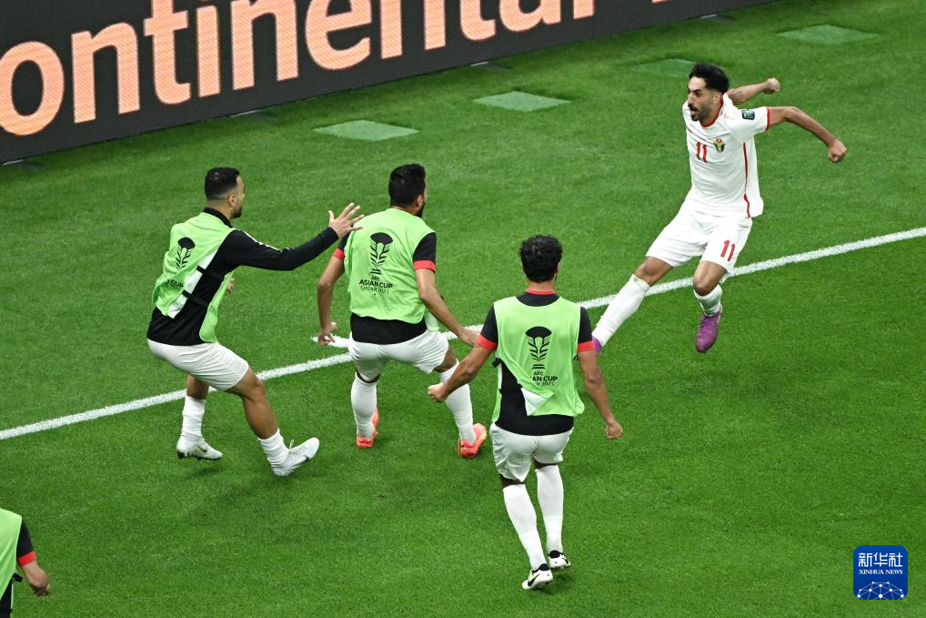 2月10日,约旦队球员庆祝进球。新华社记者 丁汀 摄