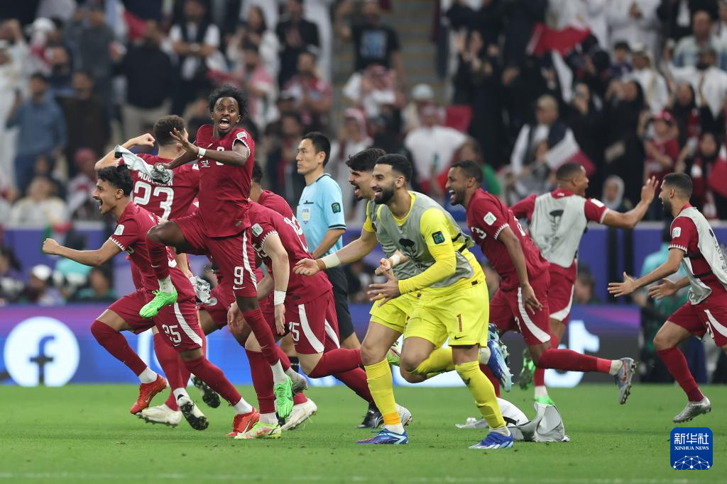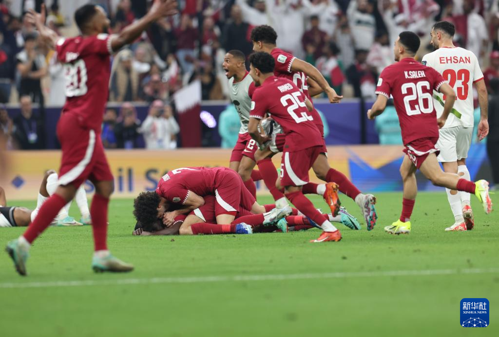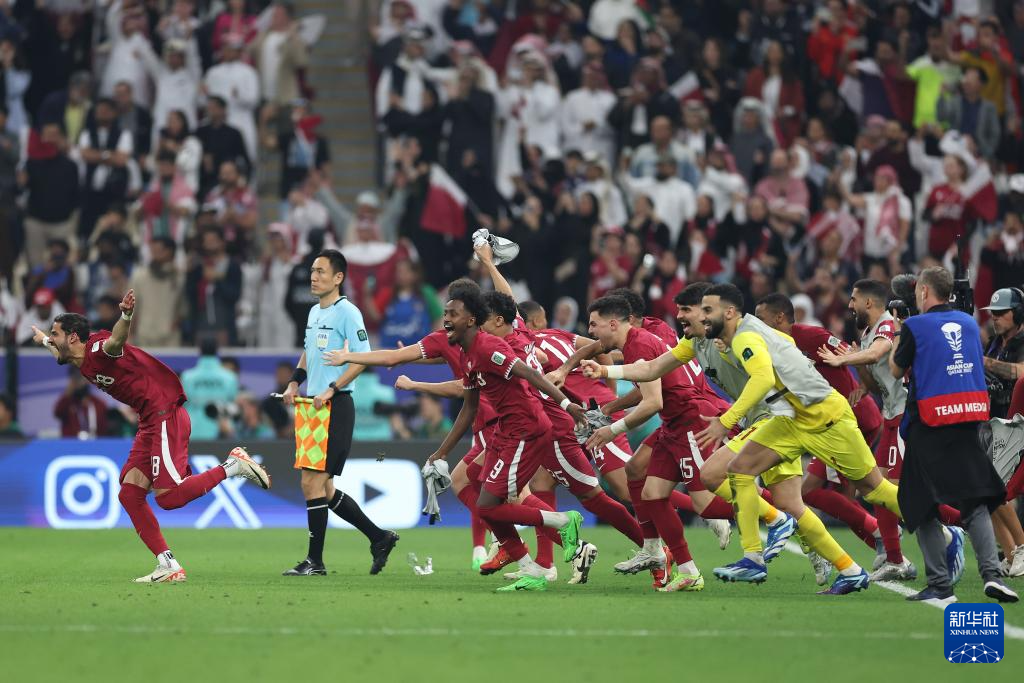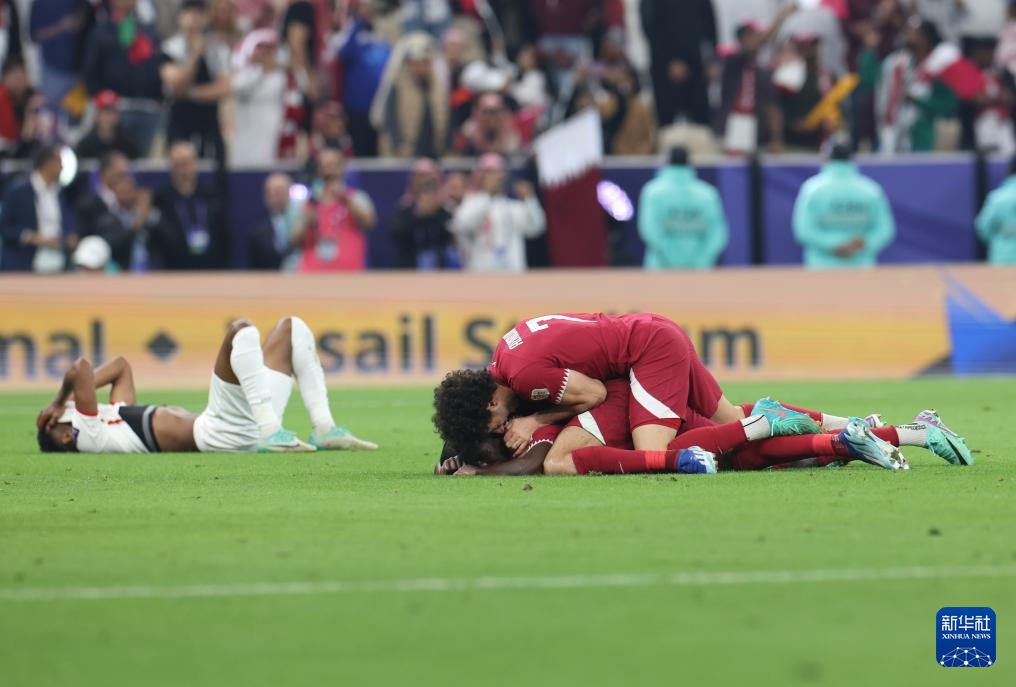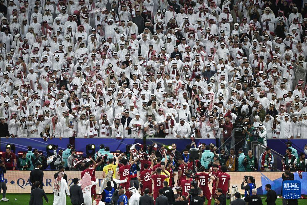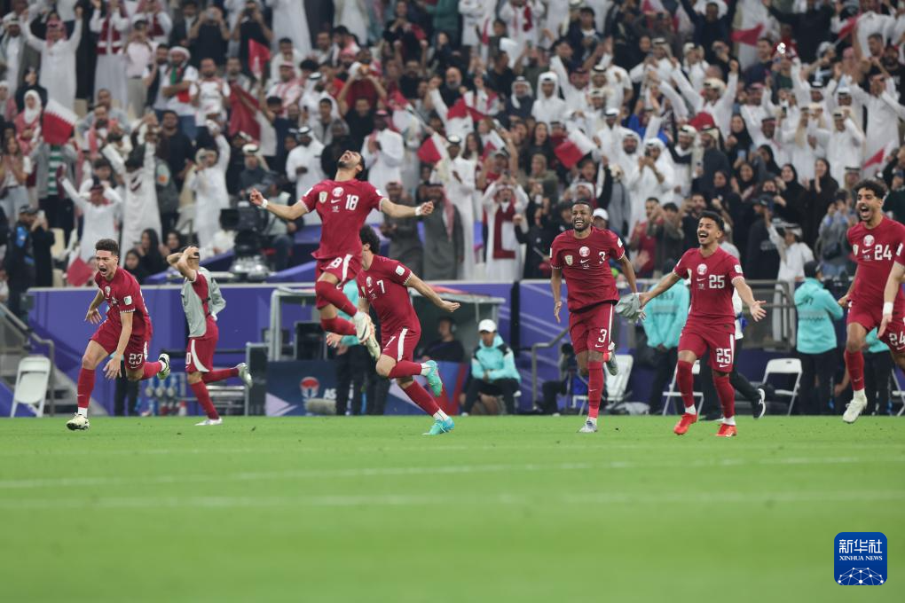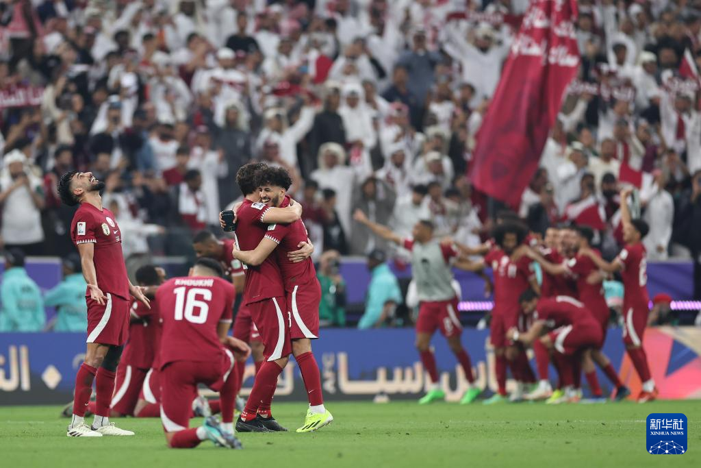 2月10日,卡塔尔队球员在夺冠后庆祝。新华社记者 贾浩成 摄