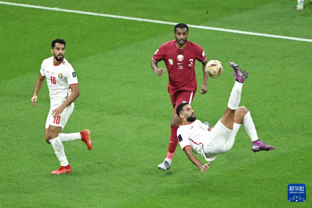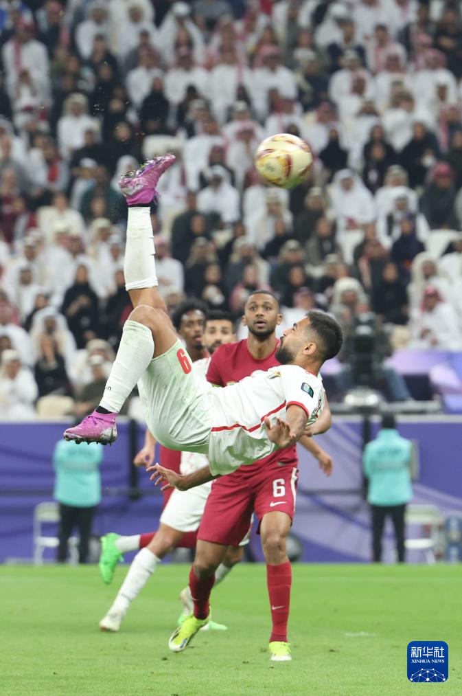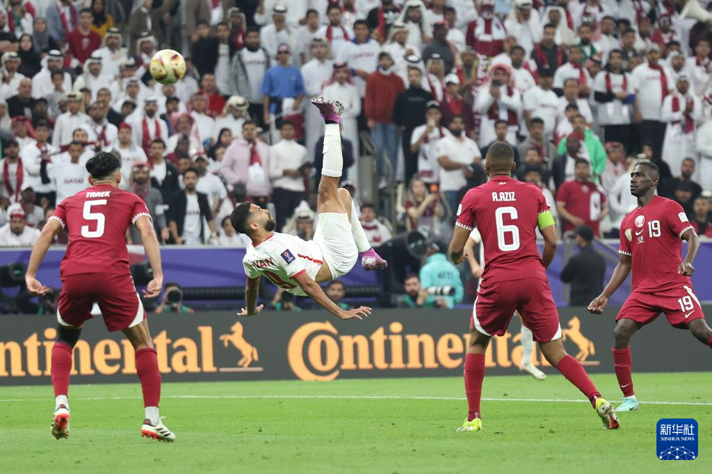 2月10日,约旦队球员阿里·奥尔万(左二)在比赛中倒钩射门。新华社记者 贾浩成 摄