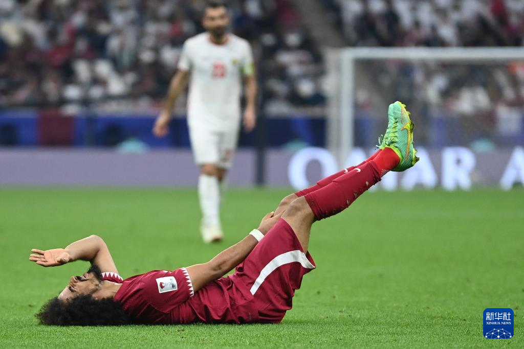2月10日,卡塔尔队球员阿克拉姆·阿菲夫在比赛中受伤倒地。新华社记者 江汉 摄