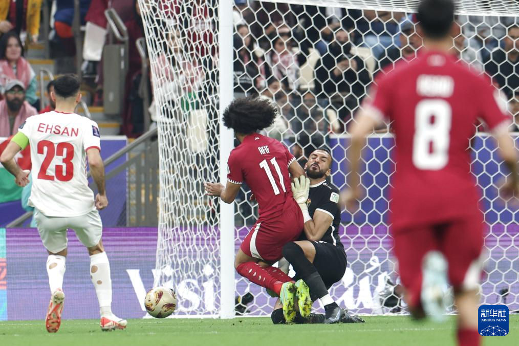 2月10日,卡塔尔队球员阿克拉姆·阿菲夫(右)在禁区遭到约旦队门将亚齐德·阿布莱拉犯规,随后卡塔尔队获得本场第三个点球。新华社记者 江汉 摄