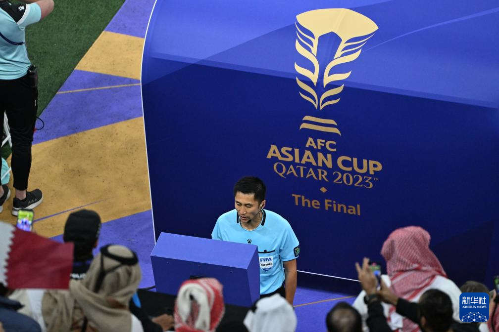2月10日,主裁判马宁(中)在比赛中查看VAR(视频助理裁判)。新华社记者 孙凡越 摄