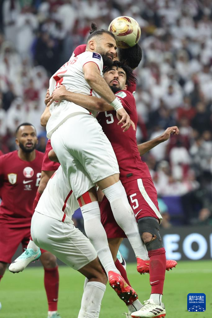 2月10日,约旦队球员亚赞-阿拉伯(左前)与卡塔尔队球员塔里克·萨勒曼(右前)在比赛中争顶。新华社记者 贾浩成 摄