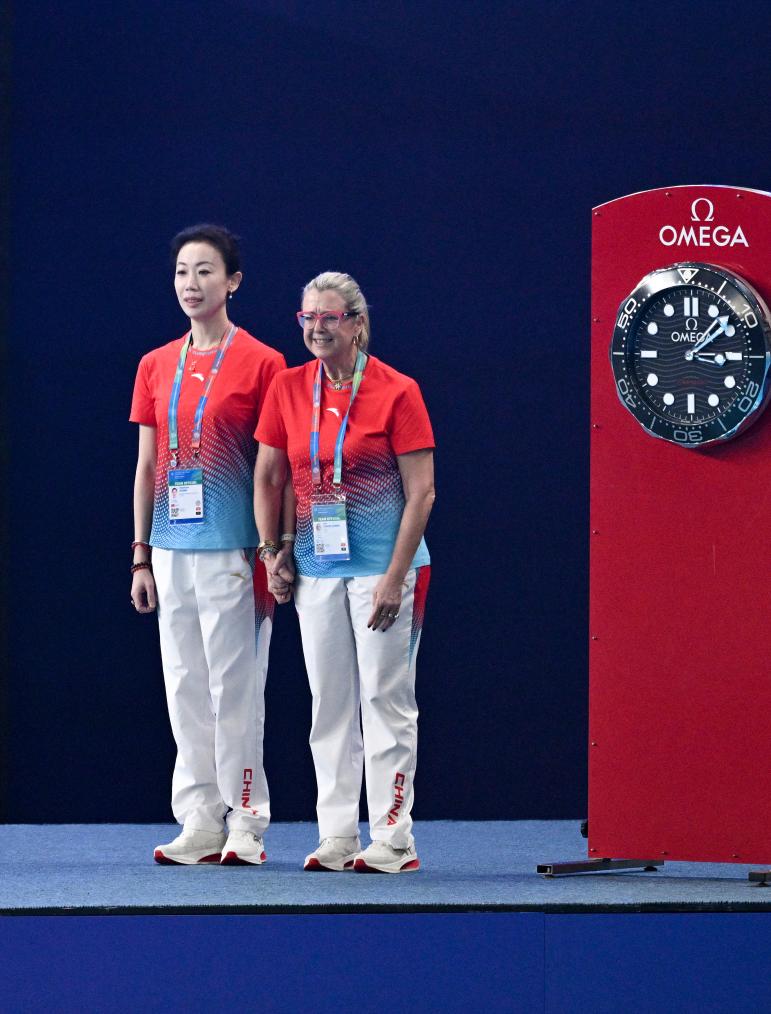2月6日,中国队教练张晓欢(左)、安娜在场边观赛。当日,2024年世界游泳锦标赛花样游泳集体技术自选决赛在卡塔尔多哈举行,中国队获得冠军。新华社记者 夏一方 摄