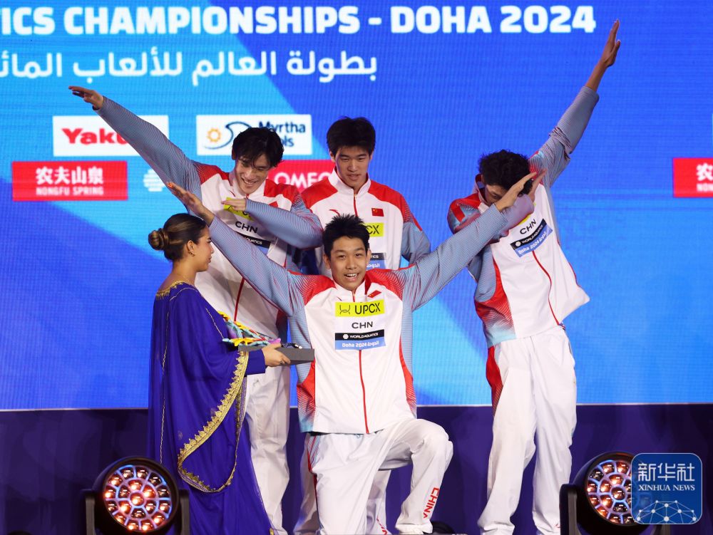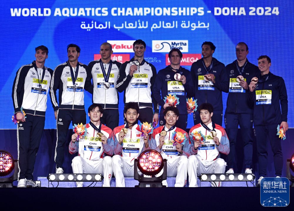 当地时间2月11日,在卡塔尔多哈进行的2024年世界游泳锦标赛游泳项目男子4X100米自由泳接力决赛中,中国队以3分11秒08的成绩夺冠。意大利队和美国队分获银牌和铜牌。中国队第一棒潘展乐游出46秒80的成绩,打破由罗马尼亚名将波波维奇保持的男子100米自由泳世界纪录,同时也刷新了游泳世锦赛赛会纪录和亚洲纪录。