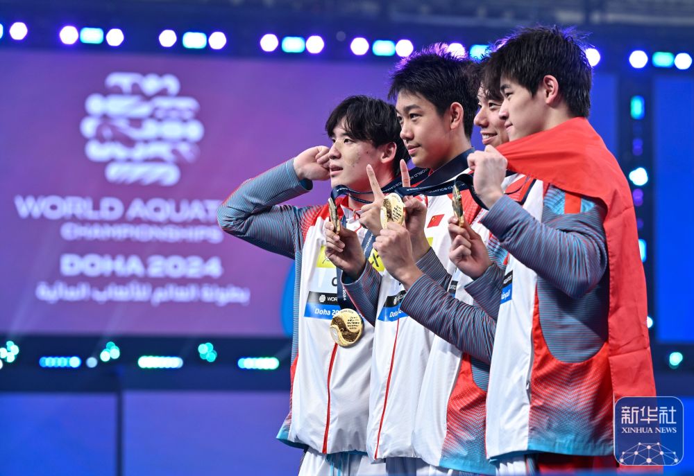 ↑中国队选手王浩宇、张展硕、季新杰和潘展乐(从左到右)在颁奖仪式后合影庆祝。