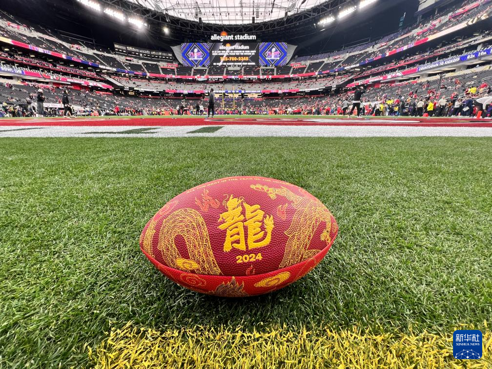 2月11日,在美国内华达州拉斯维加斯举行的第58届美国职业橄榄球大联盟(NFL)“超级碗”总决赛上,美国职业橄榄球大联盟(NFL)推出的“龙”标限量收藏版橄榄球在现场展示。新华社发