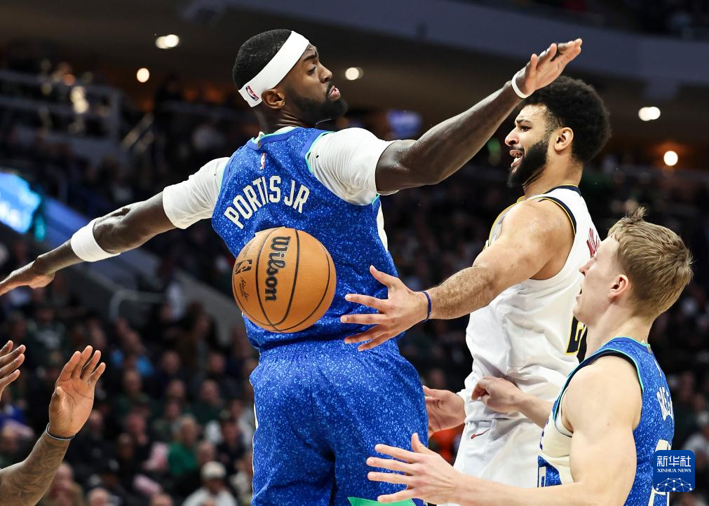 2月12日,掘金队球员尼古拉·约基奇(左)与队友迈克尔·波特(右)在比赛中与雄鹿队球员布鲁克·洛佩兹争抢位置。新华社发(乔尔·莱纳摄)