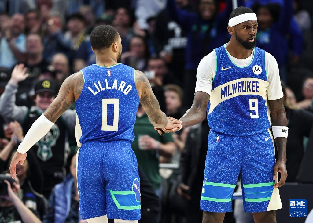 2月12日,雄鹿队球员达米安·利拉德(左)与队友鲍比·波蒂斯在比赛中击掌庆祝。新华社发(乔尔·莱纳摄)