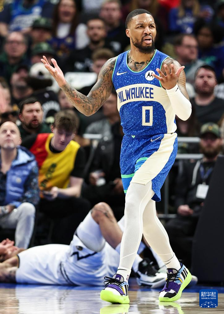 2月12日,雄鹿队球员达米安·利拉德在比赛中质疑裁判。新华社发(乔尔·莱纳摄)