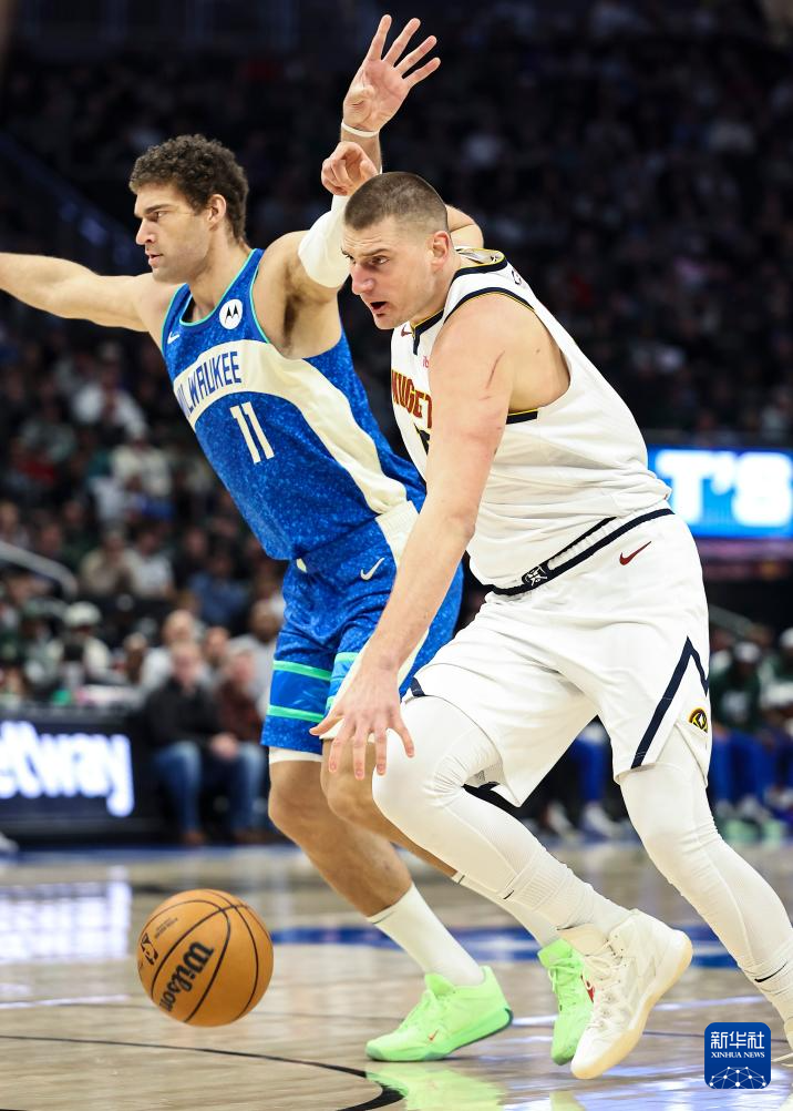 2月12日,掘金队球员尼古拉·约基奇(右)在比赛中运球。新华社发(乔尔·莱纳摄)
