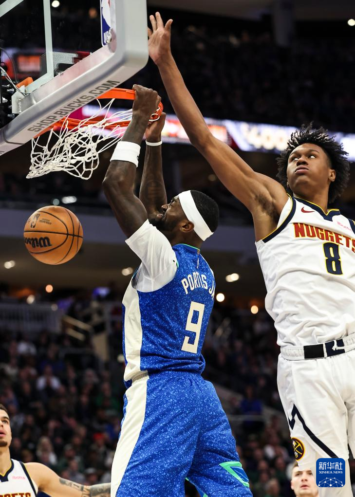 2月12日,雄鹿队球员鲍比·波蒂斯(左)在比赛中扣篮得分。新华社发(乔尔·莱纳摄)