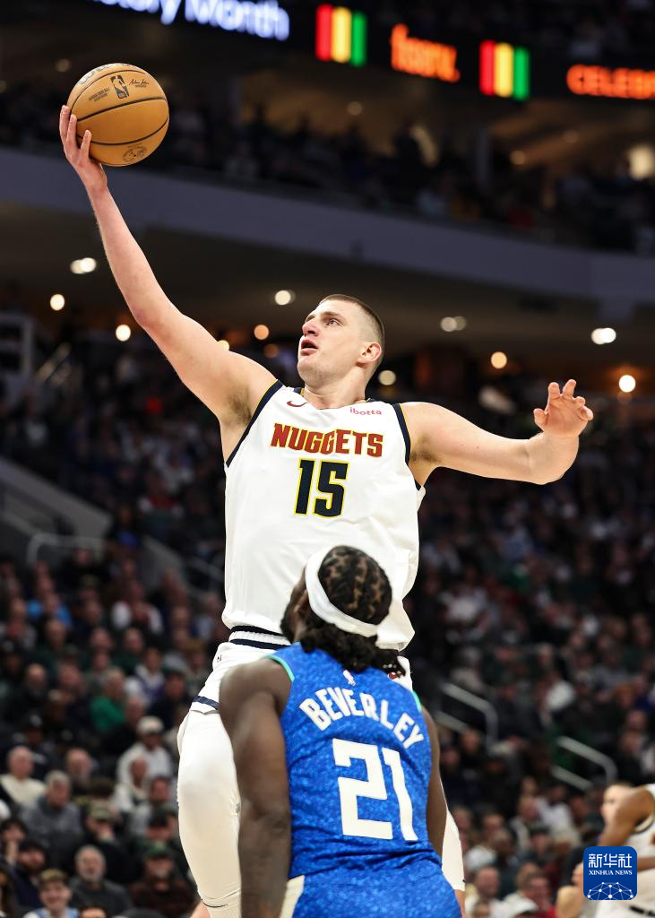 2月12日,掘金队球员尼古拉·约基奇(上)在比赛中上篮。新华社发(乔尔·莱纳摄)