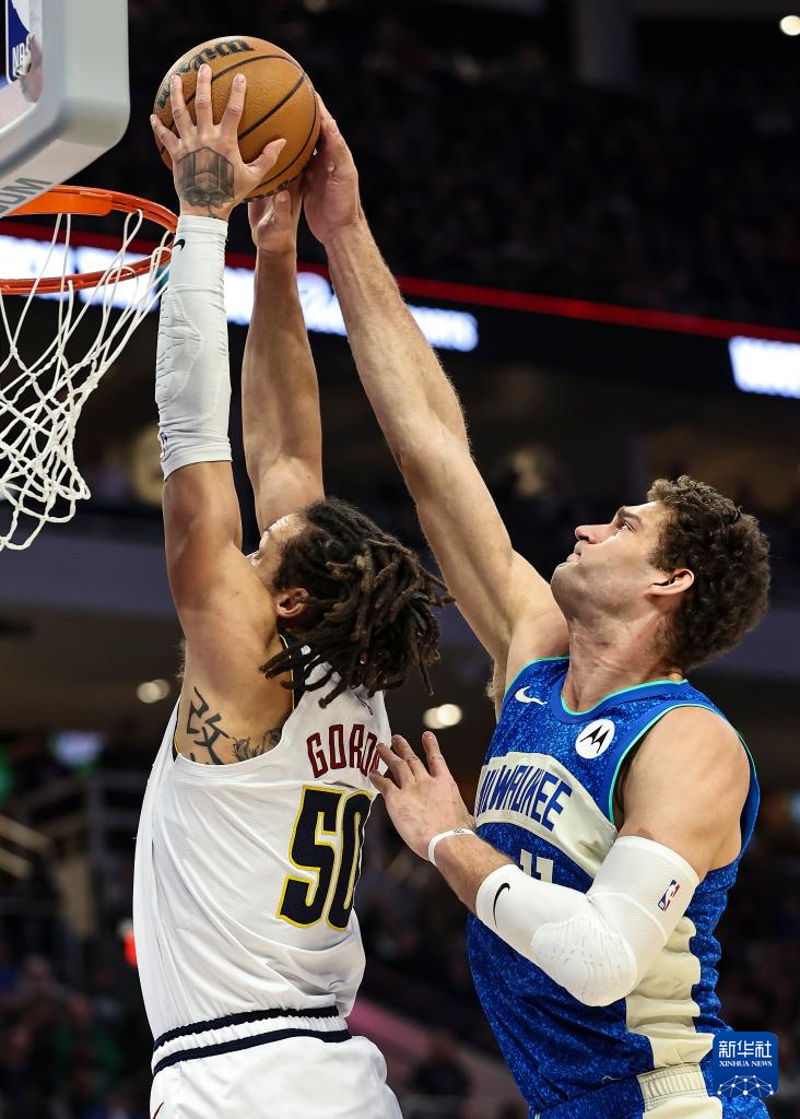 2月12日,雄鹿队球员布鲁克·洛佩兹(右)在比赛中封盖掘金队球员阿隆·戈登。新华社发(乔尔·莱纳摄)