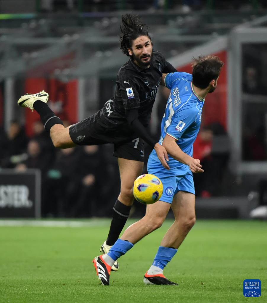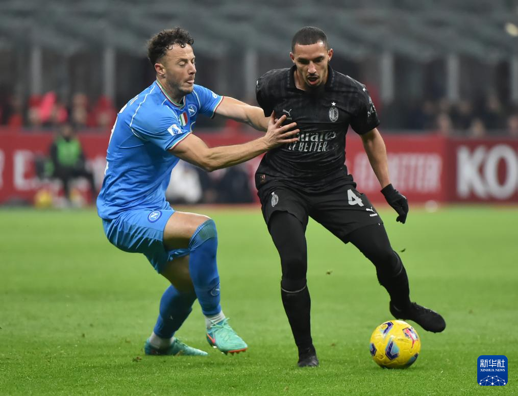 2月11日,AC米兰队球员莱奥(右)与那不勒斯队球员拉玛尼在比赛中拼抢。新华社发(阿尔贝托·林格利亚摄)