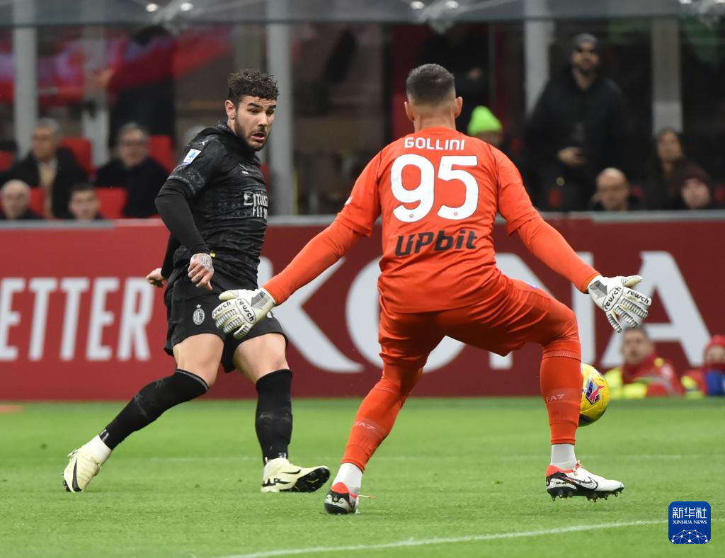 2月11日,AC米兰队球员特奥·埃尔南德斯(左)在比赛中射门得分。新华社发(阿尔贝托·林格利亚摄)